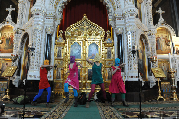 In her closing statement, Yekaterina clearly and succinctly described the reasoning behind their choice of location: “That Christ the Savior Cathedral had become a significant symbol in the political strategy of the authorities was clear to many thinking people when Vladimir Putin’s former [KGB] colleague Kirill Gundyayev took over as leader of the Russian Orthodox Church. After this happened, Christ the Savior Cathedral began to be openly used as a flashy backdrop for the politics of the security forces, which are the main source of political power in Russia….In our performance we dared, without the Patriarch’s blessing, to unite the visual imagery of Orthodox culture with that of protest culture, thus suggesting that Orthodox culture belongs not only to the Russian Orthodox Church, the Patriarch, and Putin, but that it could also ally itself with civic rebellion and the spirit of protest in Russia.”