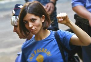 Nadezhda Tolokonnikova (11/07/1989) born with Saturn, Uranus, and Neptune conjunct in Capricorn, as well as her Scorpio Sun conjunct Mercury in balsamic conjunction to Pluto in Scorpio, represents the Capricorn Uranus-Neptune generation just now beginning to step into their power, as well as carrying some strong energy for the Pluto in Scorpio generation! With a Capricorn Saturn that is balsamic to Neptune and new phase with Uranus, she has the power to ground the idealistic energy of Uranus-Neptune into direct action. In combination with her strong Scorpio energy, she represents a femininity that is not going to back down to oppressive power structures and will integrate and merge anger against that system into creative and artistic protests that will be instantly communicated across the wide ranging social network of the Internet that was developed during the Uranus-Neptune time of her birth. Nadezhda in particular embodies the strong Scorpio energy carried by Pussy Riot, seeking to test taboos of culture in order to create a transformational shift of status quo cultural values that have become fixed- such as are involved in orthodox religious viewpoints linked into oppressive power structures.