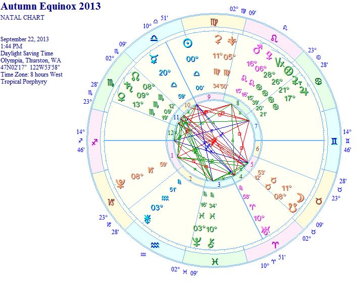 This particular equinox chart is incredibly powerful and among other themes associated with the equinox, it does point to a potential for balancing masculine and feminine energy within each of us. However, there are also signs of their being some major conflict between masculine energy wanting to boldly pursue desire and passion versus feminine energy that is penetrating to the core of everyone and everything and demanding complete honesty and authenticity. If the striving masculine energy is genuine it’s ambition could be a catalyst for new growth; if the masculine energy is too prideful, egotistical, oppressive, or vain, the feminine energy will see through it and cut it down to size. Here in Olympia, Washington we are having a cold and rainy equinox morning, with the winds accelerating and leaves and weak branches correspondingly falling from the trees outside. In accordance, with the current astrological winds perhaps our own leaves and branches we are ready to release from our core trunk will fall away. The chart for the Autumn Equinox here in Olympia, Washington is below: