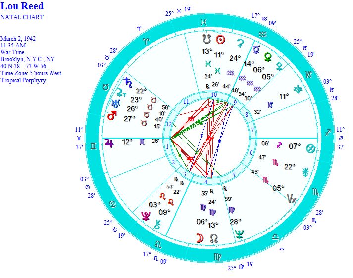 2. This is finely detailed and deeply thoughtful assessment of the astrological influences on Lou Reed, so thanks for sending me the link as it is so rare to find this level of attention and understanding given to a rock poet, but we need much more of these. I like how deftly you have woven in all the strands, including Laurie Anderson. Do you do such analyses for other artists as well? I expect it is your personal eulogy to Reed as well, and it was odd to notice how deeply affected I was by his passing. Did you ever get to see him play live? I saw him a couple of times in Manchester at the Free Trade Hall and his darkness and unpredictability were evident then.