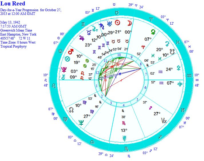 There is a connection in Lou Reed’s chart between Uranus and Pluto that is not noticeable at first unless you have knowledge in the ancient astrology technique of antiscia that involves symmetry across the cardinal axis.  Kate Petty is a Seattle astrologer who is prolific in her writing using this technique, and posted this article containing a lot of charts and astrology information concerning Lou Reed’s passing.  If you are unfamiliar with these techniques these charts may seem confusing, but it is significant that Lou’s Leo Pluto and Taurus Uranus connect through antiscia, since he happened to be born at a time when Pluto and Uranus were not only conjunct, but were conjunct on the North Node of his Moon in Virgo.